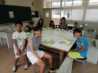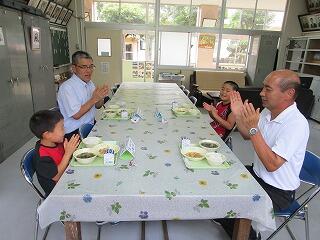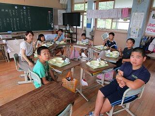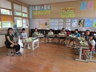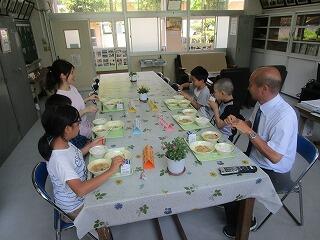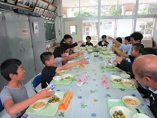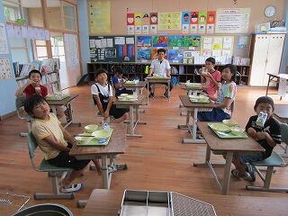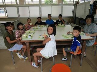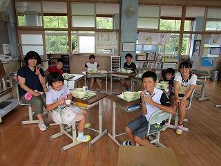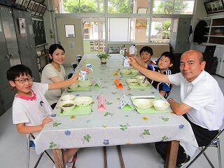 7月のバースディ給食でした。1年生と2年生の児童に混じって、教頭先生も参加でした。