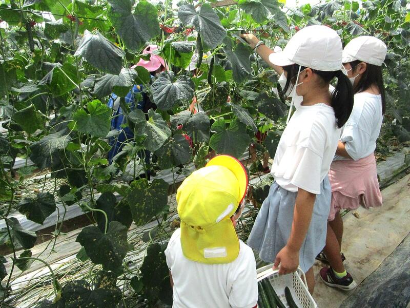 今日は、5・6年生によるきゅうりちぎりが行われました。地域の方のビニルハウスを訪れ、保育園児と交流しながらいっしょに行いました。ハウスの中は暑く、休憩しながら収穫しました。もう20年近く続いている行事です。穫ったきゅうりは全校児童で分けました。地域の方々の協力に感謝です。