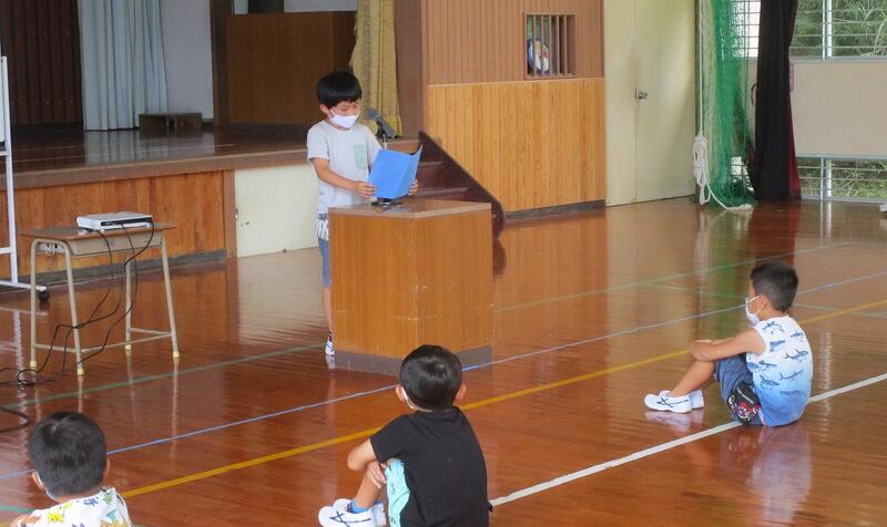 今日から2学期がスタートしました。大きな事故やけが等がなく、無事2学期が迎えられてよかったです。1時間目は始業式が行われました。まず、代表児童の5年生が2学期にがんばりたいことの作文を発表しました。校長先生の話では、2学期は大きな行事が続くため、みんなで力を合わせて取り組み、本年度スローガン「みんなでつくろうみんなの本城小」を実現していきましょうという話がありました。式後には保健の先生より、コロナ感染対策と熱中症対策についての話がありました。健康安全に留意して、充実した2学期を過ごしてほしいです。