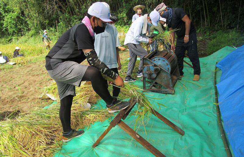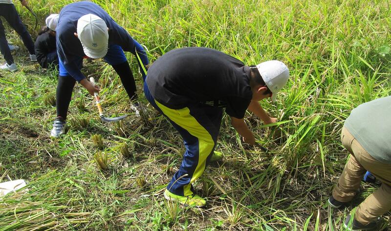 今日は、5・6年生による稲刈りが行われました。4月13日に田植えをして4か月半、JAはまゆう青年部の方々のご協力の下、稲はすくすく育ち、りっぱな餅米が実りました。まず、稲を刈り、その後の脱穀を千歯扱きと足踏み脱穀機を使って行いました。最初はぎこちない様子でしたが、慣れると要領よく行っていました。昔の人たちの苦労が分かったようです。残った稲は、コンバインで刈り取りました。収穫した餅米は、11月下旬のもちつきで使用します。ご協力いただいたの皆さんありがとうございました。