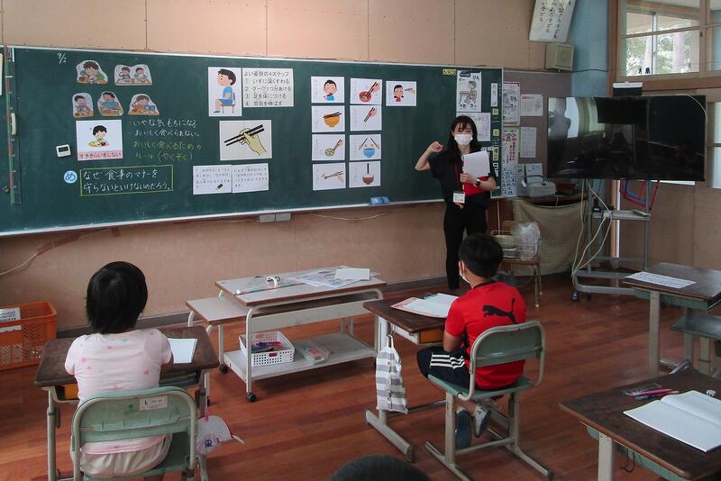 3・4年生学級では、市内の栄養教諭の先生にお越しいただき、食事のマナーについて考える学級活動の授業が行われました。食事を食べる姿勢やはしの持ち方などを実際にはしとおわんを持って学びました。今日学んだことを意識して食事をしてほしいです。