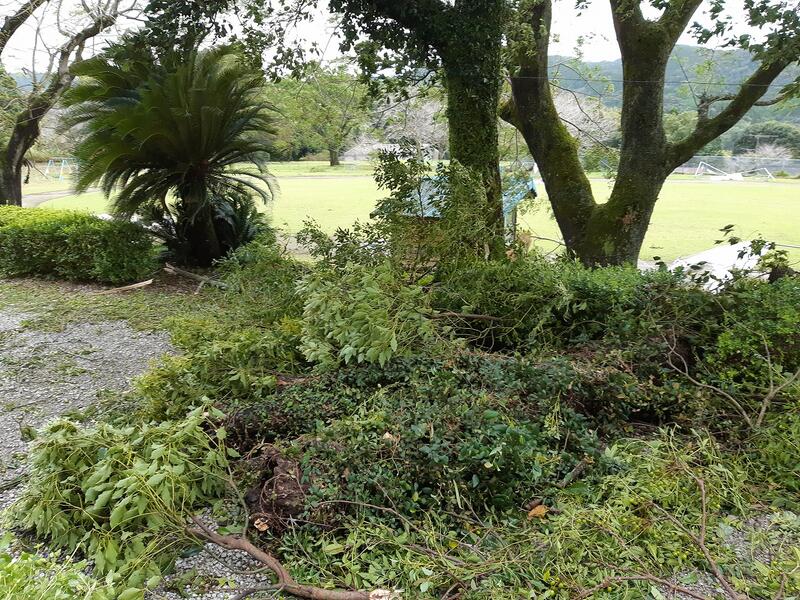 昨日、大型で非常に強い台風14号が串間市に再接近しました。今日、学校を訪れて確認を行いました。校舎内は特に問題ありませんでしたが、体育館通路の屋根が一部はがれていました。運動場では、木が散乱しており、大きな枝がテントを直撃し、テント上部が曲がっていました。全体的に見て、学校内は授業に支障が出るほどの被害はなかったようです。本城小は明日が振替休業日となってお休みのため、明日に片付け作業を行います。