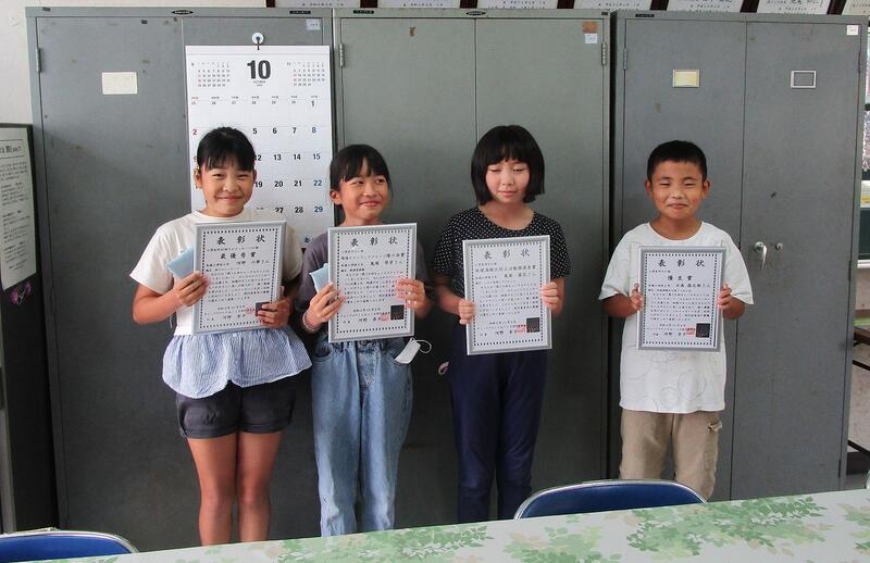 キャンドルナイトinくしまに応募した作文・標語において、4人の児童が入賞しました。作文の部が最優秀賞と優良賞、環の会賞、標語の部が地球温暖化防止活動推進員賞です。本日、給食時間に放送で紹介し、その後校長室で表彰を行いました。おめでとうございます。