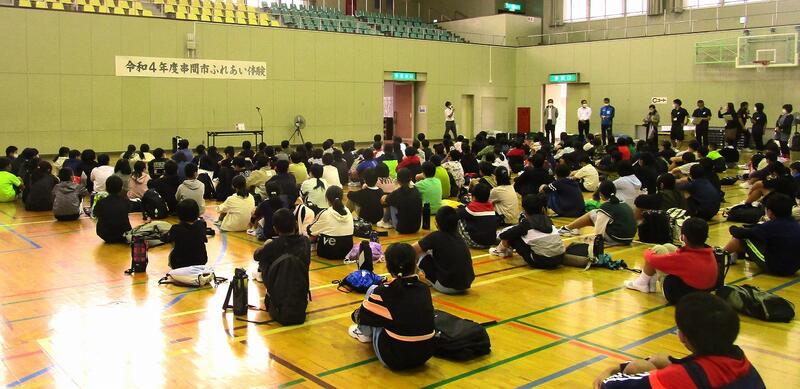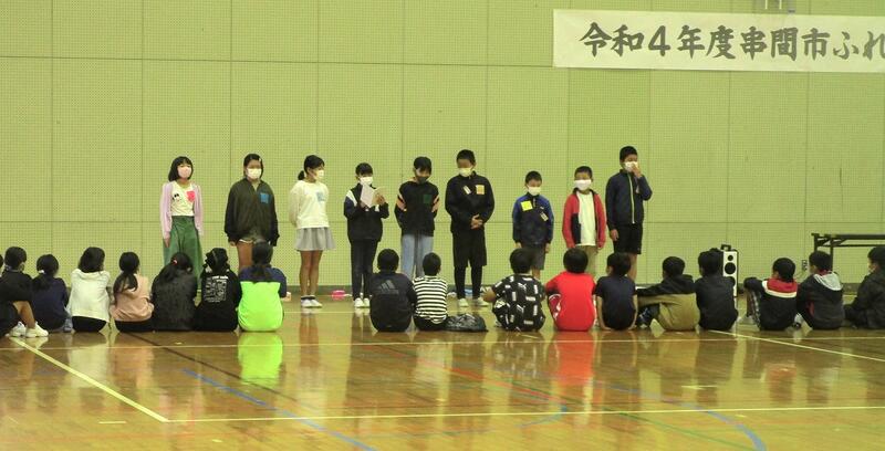 今日から明日にかけての2日間、市内小学5年生が一堂に会し「ふれあい体験」が開催されます。本城小からも9名の5年生が参加しました。1日目の今日は、開会式、ふれあい活動、防災設営訓練、ハイゼックス炊飯、レクレーションが計画されています。写真は、開会式と学校紹介の様子です。楽しい2日間にしてほしいです。