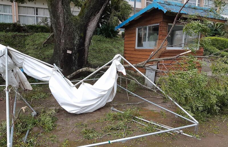 昨日、大型で非常に強い台風14号が串間市に再接近しました。今日、学校を訪れて確認を行いました。校舎内は特に問題ありませんでしたが、体育館通路の屋根が一部はがれていました。運動場では、木が散乱しており、大きな枝がテントを直撃し、テント上部が曲がっていました。全体的に見て、学校内は授業に支障が出るほどの被害はなかったようです。本城小は明日が振替休業日となってお休みのため、明日に片付け作業を行います。