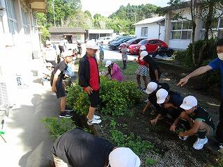 清掃時間に地震が発生したと想定し、全員が運動場に駆け足で避難しました。