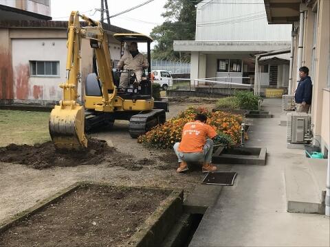 ミミズ等を探していたのは、イノシシではなくムジナでした。危険なので、児童にも注意するよう指導しました。(写真撮影:坂田(事務)提供)