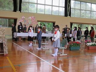 4月12日、3名の新入児童が入学しました。緊張した様子で入場しましたが、返事やお辞儀など、とても1年生とは思えない立派なものでした。在校児童全員による歓迎のことばでは、学校生活などについてわかりやすく発表しました。最後に、地区青少協会長さんから、登下校時に着用する黄色の帽子が贈呈されました。