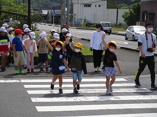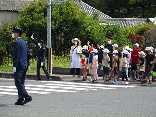 4月23日に、串間市警察署と交通安全協会指導員の方から安全な横断歩道を渡り方を教えていただきました。「信号が青でも車が停まったかを確認し、速歩きで渡ること。渡っているときも手を挙げて右左を見ながら渡ること」などを指導してもらって、本城交差点で実際に横断の練習をしました。自動車が走行している中での練習で、緊張した児童もいました。これから、きょう学んだことを実践しながら安全に気を付けて登下校してもらいたいものです。