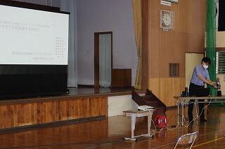 教室で児童がアナフィラキシーショックで意識を失ったという設定で、全職員で「緊急時の対応訓練」を行いました。串間市消防署員3名の方に指導助言をお願いし、119番通報、AEDを用いて心肺蘇生を施しながら救急隊員の到着を待つ訓練でした。事後研修で、訓練時の動画を見ながら反省点を出し合い、署員の方から助言をいただきました。