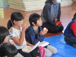子どもたちは大喜びでもちをつき、ついたもちを丸めていました。中には、プロ並みのつきかたをする児童もいました。