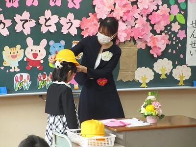 入学式後の学級活動の様子です。学級担任の先生から一人一人に帽子が配付されました。とてもうれしそうでした。