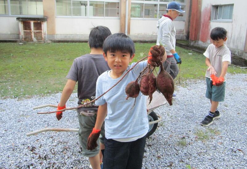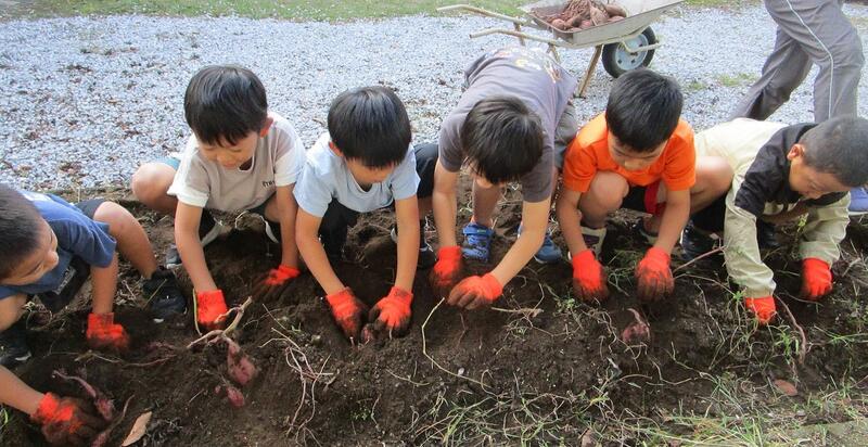 今日は、1・2年生が学級園に植えた芋を収穫しました。芋がとれるたびに大きな声を出していました。思いのほか大きな芋がたくさんとれてびっくりしていました。みんな満足そうないい顔をしていました。