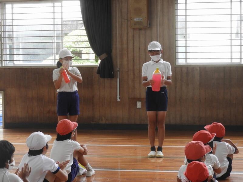 ペットボトルを振ると、水の色が白や赤になりました。赤団、白団決定です。