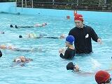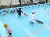 この日を心待ちにしていた児童は、校長先生や体育主任の先生の話の後、準備運動を行い、全員がはじけるような笑顔でプールに入っていきました。