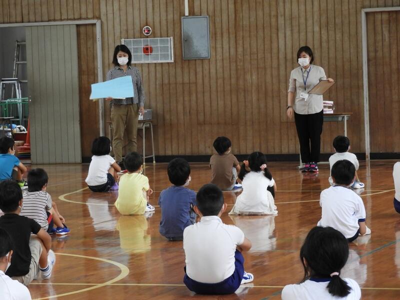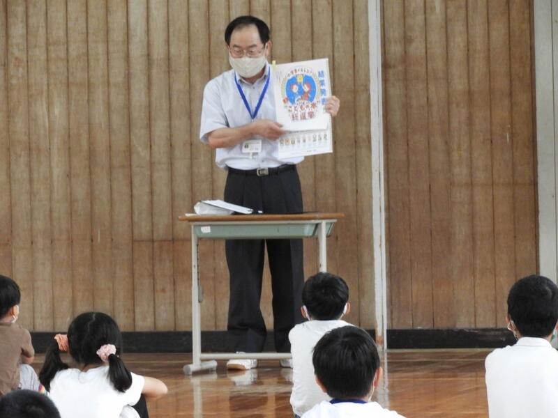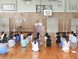 初めに校長先生の話でした。新型コロナウイルス感染症対策の話や本の話をされました。実際に「ざんねんな生き物」を本を紹介されたり、動物のクイズを出されたりと、興味深い話でした。