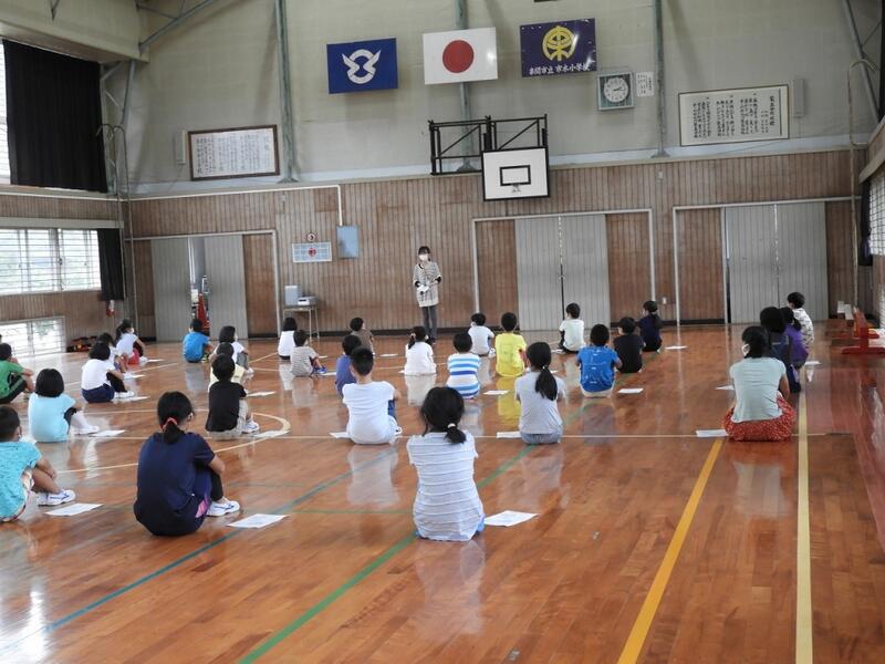 訓練後は、ソーシャルディスタンスを保ちながら体育館に集合し、警察の方の話(はちみつじまん」・「ひまわり」等の話を聞きました。