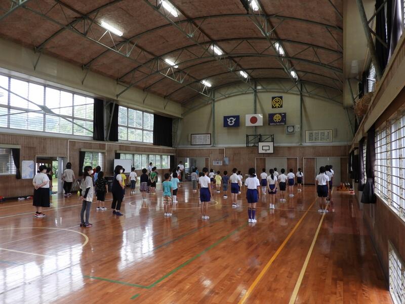 6月3日(水曜日)に全校朝会を行いました。令和2年度になって初めての全校朝会でした。ソーシャルディスタンスを保ちながら体育館で行いました。