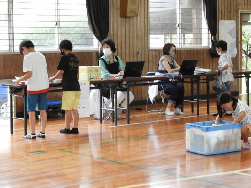 6月11日は、串間市立図書館の移動図書館の日でした。串間市立図書館の職員の方々は、雨の中、体育館に本を運んでいただいたり、返却作業をしていただいたりしました。