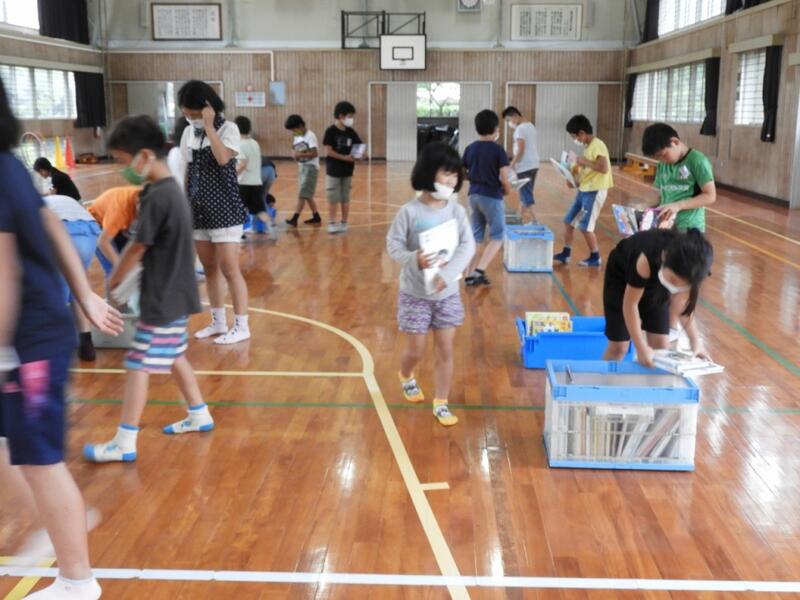 その後、児童が体育館に入ると、たくさんの本の中から興味のある本を探していました。また、読み聞かせもしていただき、子ども達は真剣に話を聞いていました。