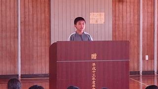 本校は、6年生の大下桃華さんが代表で、「大好きな市木」と題して、元気な声で自分の考えを述べました。市木での生活、豊かな自然、仲良し三人組の友情、地域の人たちの温かい心、そして、中学校に行っても思い出を大事にして頑張ることを述べました。