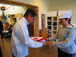 12月20日 市木ディサービスにおいて、集まった赤い羽根共同募金を社会福祉協議会の代表の方に届けました。金額としては、それほど多くはなかったけれど、とても喜んでもらえました。
