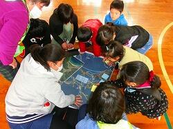 次に、登校班に分かれて、地区ごとに、どこに避難すればよいか、どこが危険かを話し合い、地図にマークしていき、それを発表していきました。
