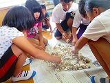 先の遠足(13日)にて、現地で砂の造形を楽しみましたが、今日は学校で、その時拾った貝殻を使って、砂浜で感じた海の素晴らしさや楽しさを振りかえらせ、1年生が事前に準備した絵を基に表現活動をしました。