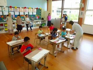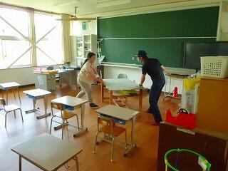 プールサイドで開会行事をすると寒くなるだろうと、開会行事は特別教室で行いました。