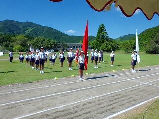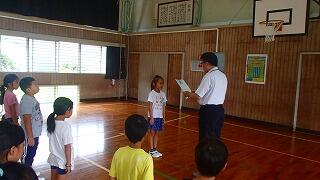 その後、雨量計やホイッスルなどの記念品の贈呈があり、代表で5年の「工藤君」が、お礼の言葉として、代表で5年の「大下さん」がそれぞれ前に出て、役を務めました。