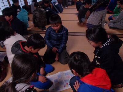 次に、三校が交流を深めるために、正月によくした「すごろく」や、くしま学で学習した内容をカルタにした「くしま学カルタ」で楽しみました。