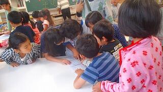 午前中は、1,2年生と近くの市木保育所の年長さんを招待しての授業でした。テーマは「ヒトの体の中の魚」~脊椎動物の体の中には魚類の特徴を示すところがあることや、魚がどのようにヒト(哺乳動物)になったか、その進化の過程を楽しく学ぶ授業でした。また、午後の授業は「海の食べる、食べられる」~水中の食物連鎖を自分のこととして考えながら、食育や環境教育に結びつけていく授業でした。