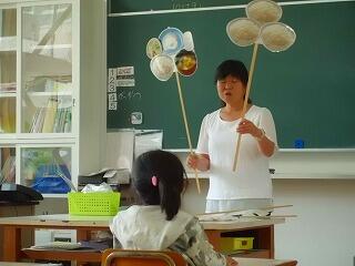 上の写真は、学習中に濁った水(右手)を準備しておいて、二枚貝を入れておいたところ、終わる頃になったら、すみきった水になった(左手)ことを紹介されました。動物が水をきれいにする例を示してくださいました。