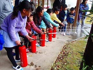 この後、全員で消火器を使って、デモの消火体験をしました。