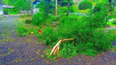 倉庫が破壊。道具倉庫が倒れ、太もも大の枝が8本も折れ、国旗掲揚台のポールが折れました。他の学校では、もっと大きな被害もあったようでした。