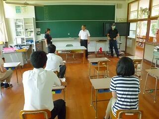 串間警察署の方を2名来てもらい、実際にどのように対応して児童たちを守るかを実技研修しました。実技では、職員の対応がまずく、刺されるシーンもあり、どのようにしたらよいかを真剣に研修しました。