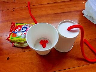 本来の柱松松明は、火をつけて投げる松明ですが、子どもには危険なので子どもたいまつは、紙コップや粘土で作ります。