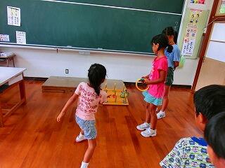 最初に1年生や2年生の教室で、魚釣りゲーム、輪投げ、ボーリング、的あてゲームなどを行いました。これは、1,2年生が生活科で作ったものを使わせてもらいました。