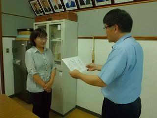 その後、雨量計やホイッスルなどの記念品の贈呈があり、代表で5年の「工藤君」が、お礼の言葉として、代表で5年の「大下さん」がそれぞれ前に出て、役を務めました。