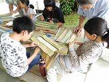市木小・秋山小・大平小の3校で交流も意図した合同実施でした。4~6年生の児童が、広告美術(プレート作り)と畳工芸(ミニ畳作り)の2つに分かれて、それぞれ技能士の方々から指導していただきながら熱心に取り組み、全員がすばらしい作品を仕上げていました。