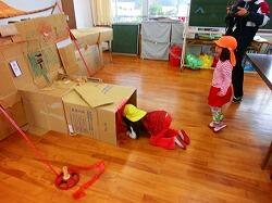 交流会では、一緒にじゃんけん貨物列車、輪投げ、だるまさんがころんだ等の交流ゲームをしたり、読み聞かせ、授業参観、3・4年生が図工遊びで造形遊びで作った段ボールのひみつ基地で遊んだりと、楽しい交流ができました。