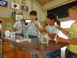 上の写真は、学習中に濁った水(右手)を準備しておいて、二枚貝を入れておいたところ、終わる頃になったら、すみきった水になった(左手)ことを紹介されました。動物が水をきれいにする例を示してくださいました。