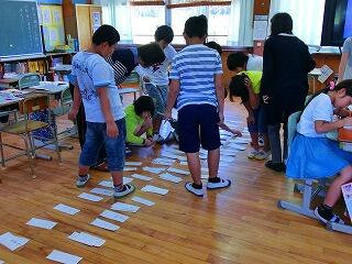 6年生は、国語の授業で、カードに書いた三文字熟語を床に並べて、グループ分けをしました。