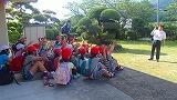 午後の活動は、市木中学生と合同で、ゴミ拾いなどの清掃活動をしました。軽トラックいっぱい、ゴミを拾い、みんな満足気味。記念に幸島をバックにした集合写真を撮りました。