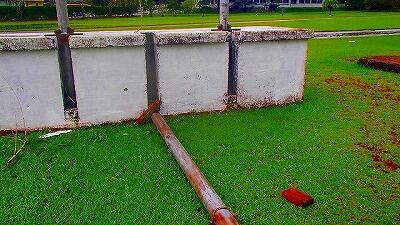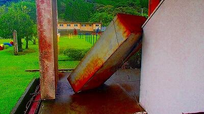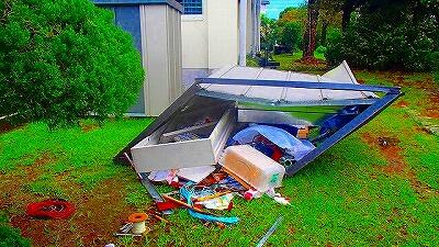 倉庫が破壊。道具倉庫が倒れ、太もも大の枝が8本も折れ、国旗掲揚台のポールが折れました。他の学校では、もっと大きな被害もあったようでした。