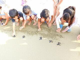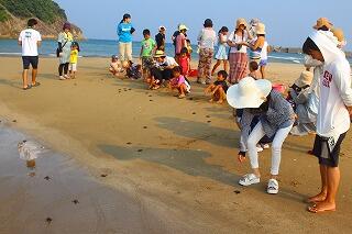 8月4日(土)にアカウミガメの保護、育成活動をされている地域の方から「明日、アカウミガメが産まれそうだ」という連絡をいただき、メールで子どもたち、保護者のみなさんに連絡し、参加を呼びかけました。