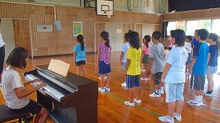 最初に、みんな元気を出すために「市木小学校」の校歌を全員で歌いました。これまで伴奏は卒業した「大下」さんがしていましたが、今回から「中山 優花」さん(4年生)がしてくれます。上手に伴奏していました。