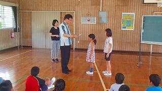 6月は読書月間で、その取組として「読書ビンゴ」という活動をしてきました。それぞれ頑張ってビンゴを達成した児童がいましたが、今回は全ビンゴを達成した「島田れあら」さん(2年生)、「中山 優花」さん(4年生)に賞状を渡しました。