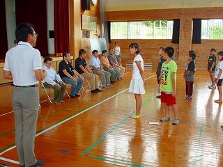秋山小学校の体育館に秋山小学校、大平小学校、市木小学校の4年生以上が集まりました。