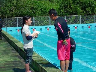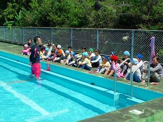 次は、実際に服やスリッパを履いたままプールに入り、普段の水泳の学習と違うことを歩いたり、浮いたりして確かめました。そして服を着たままどのようにして泳ぐか、ペットボトルをもってどのように浮いてみるのか、短い時間でしたが、児童たちはいい体験をしたと思っています。